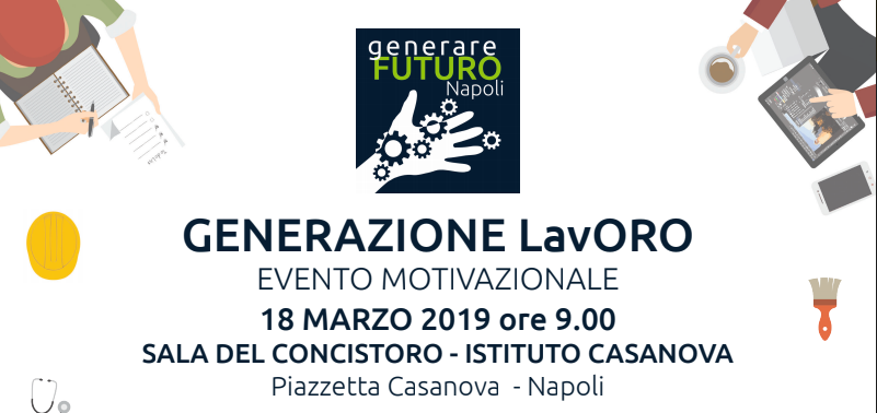 Con l’evento motivazionale Generazione Lavoro lunedì 18 marzo alle ore 9 nella Sala del Concistoro dell’Istituto Professionale «Alfonso Casanova» si concluderà il segmento napoletano del progetto Generare Futuro. Sostegno ai giovani talenti, promosso dal Forum Nazionale delle Associazioni Familiari in 5 regioni italiane, in partenariato con le Acli, e finanziato dalla Presidenza del Consiglio dei Ministri. Dipartimento della Gioventù e del Servizio Civile.