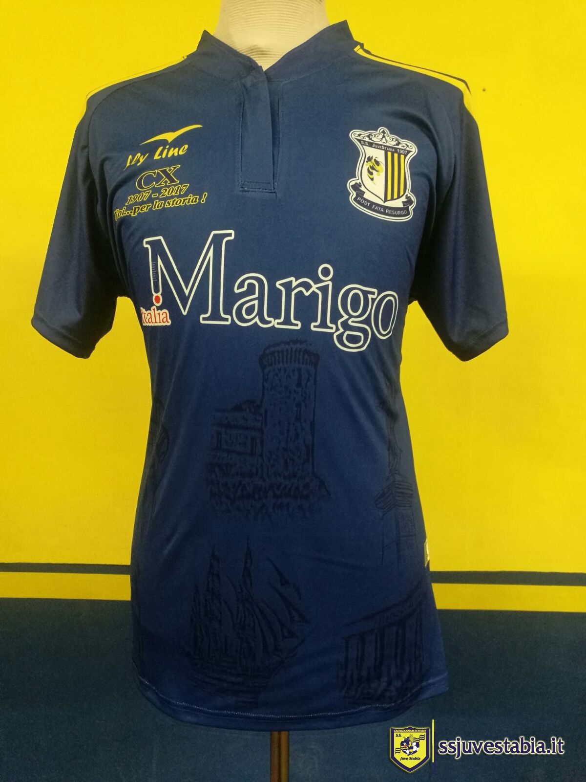 S.S. Juve Stabia è orgogliosa di presentare #110eVespe, la maglia celebrativa realizzata dallo sponsor tecnico Fly Line per festeggiare i 110 anni del calcio a Castellammare. La maglia, prodotta in serie limitata e da collezione, sarà indossata dai calciatori gialloblù all’ingresso in campo, prima del fischio d’inizio della partita di campionato a Cosenza, che si terrà proprio il 19 marzo, la data in cui è nata la prima squadra di calcio a Castellammare nel 1907. Curata nei minimi dettagli, la maglia presenta alcuni dei simboli della Città delle Acque, dalla Cassa Armonica al Castello medioevale, dal magnifico veliero della Marina Militare “Amerigo Vespucci” alle 28 fonti minerali, senza dimenticare alcuni dei luoghi più importanti della città, come Piazza Principe Umberto, con il suo monumento ai caduti di tutte le guerre, e Piazza Cristoforo Colombo con la sua torre dell’orologio. A suggellare il rapporto esistente da oltre un secolo tra la squadra di calcio e la città, lo sponsor tecnico Fly Line ha proposto uno speciale scudetto commemorativo, con una vespa, simbolo del club, ed i colori gialloblù, che si incontrano col motto “post fata resurgo”, presente nello stemma del comune stabiese. Trovano spazio infine sulla maglia, subito sotto il logo dello sponsor tecnico Fly Line, anche il 110 in numeri romani, accompagnato dalle date, “1907-2017”, e dalle parole “Noi… per la storia!”. La maglia sarà in vendita a partire da sabato 18 marzo presso lo Store Fly Line a Castellammare di Stabia (Viale Europa, 51) e on-line all’indirizzo http://www.flylinesport.it/store/