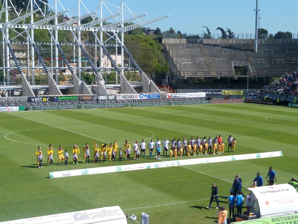 Splende un sole caldo e determinato sullo Stadio del duca di Ascoli Piceno. Tifoseria accesa e numerosa sugli spalti. Inizio fiacco, con le squadre che non si esprimono, quasi a volersi studiare a vicenda per sferrare la mossa decisiva. Al 3′ Mokulu prova un tiro debole che Lanni para senza pensiero, dopo 2′ l’Ascoli ci prova con Gigliotti che, da fuori area, lancia un pallone troppo alto per essere almeno pericoloso. Ma il Frosinone sembra voler giocare in attacco e schiacchia i bianconeri nella loro metà campo salvo qualche sporadica occasione che l’Ascoli Picchio prova a conquistare. Da segnalare un episodio al 10′ quando un giocatore del Frosinone atterra Cassata che non aveva nemmeno il pallone sui piedi, l’arbitro lascia correre tra le proteste del pubblico testimone. Al 13′ ancora il Frosinone in attacco che ci prova con Dionisi che lancia direttamente tra le mani del portiere avversario. Dopo un solo minuto, Dionisi guadagna un calcio di punizione, battuto svolgiatamente da Soddimo che non permette a Mokulu l’aggancio necessario per il giusto tiro. Al 18′ minuto uno sprint dell’Ascoli che sembra voler risalire, fallo su Cassata e ammonizione per Gori ma il Frosinone non attende nemmeno due minuti e riprende il mano le redini della partita, triangolare tra Maiello, sulla sinistra per Mazzotta che tira, Mokulu prova ad aggiustare il lancio ma resta un nulla di fatto. Al 25′ è l’Ascoli a guadagnare un calcio di punizione ma Gigliotti spreca tutto con un lancio estremamente alto. Al 30′ fallo di Almici su Maiello, punizione battuta da Mazzotta che non realizza di poco; calcio d’angolo e ennesima opportunità per il Frosinone che guadagna un altro angolo grazie all’azione di Soddimo poi Terranova ci prova di testa ma il pallone non entra lasciando il risultato sullo 0-0. Attacco senza sosta quello del Frosinone che sembra dominare sull’Ascoli che incassa ogni azione senza riuscire a reagire. Al 43′ brutto fallo di Cassata su Fiammozzi, cartellino giallo e punizione ai limiti dell’area per il Frosinone ma la palla va alta oltre la traversa. Il primo tempo si chiude senza reti e senza minuti di recupero. L’arbitro manda tutti negli spogliatoi appena scaduti i minuti regolamentari.