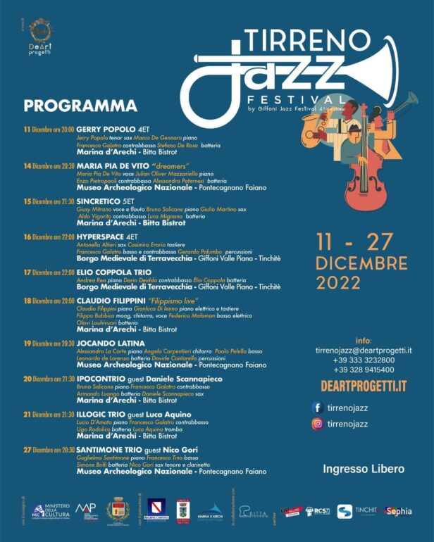 La IV edizione del Tirreno Jazz by Giffoni Jazz Festival si svolgerà dall’11 al 27 dicembre tra il Museo Archeologico Nazionale di Pontecagnano (Sa), il Borgo Medievale di Terravecchia a Giffoni Valle Piana (Sa) e il Bitta Club del Marina d’Arechi di Salerno.